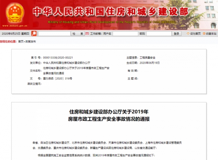 日前,住建部辦公廳下發(fā)《關于2019年房屋市政工程生產(chǎn)安全事故情況的通報》,要求,2020年,各地要深入查找本地區(qū)安全生產(chǎn)工作的薄弱環(huán)節(jié)和突出問題,推動防范化解施工安全重大風險各項部署落地見效,堅決遏制重特大事故。