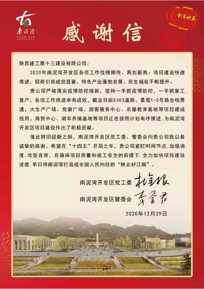 近日,陜建十三建公司收到了來(lái)自南泥灣開(kāi)發(fā)區(qū)黨工委、南泥灣開(kāi)發(fā)區(qū)管委會(huì)發(fā)來(lái)的感謝信。