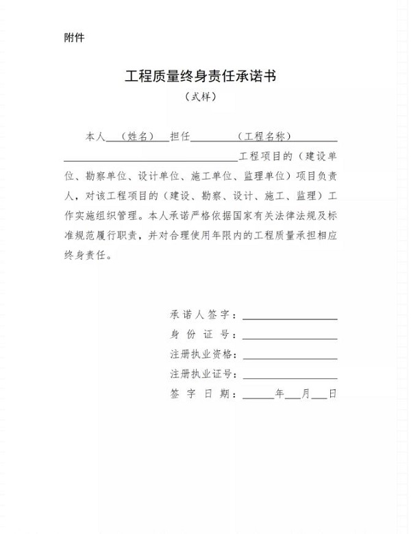 第十二條 項(xiàng)目負(fù)責(zé)人應(yīng)當(dāng)在辦理工程質(zhì)量監(jiān)督手續(xù)前簽署工程質(zhì)量終身責(zé)任承諾書(shū)(式樣參見(jiàn)附件),連同項(xiàng)目負(fù)責(zé)人證明材料,由建設(shè)單位(項(xiàng)目法人)報(bào)工程質(zhì)量監(jiān)督機(jī)構(gòu)備案。項(xiàng)目負(fù)責(zé)人如有更換的,應(yīng)按前述規(guī)定重新備案。
