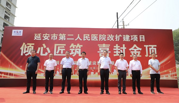 延安大學附屬醫(yī)院副院長祁軍利,延安市第二人民醫(yī)院院長武劍峰,延安城投集團副總經(jīng)理劉靜,陜建十三建集團副總經(jīng)理楊永宏、總工程師王弘起、副總經(jīng)理張鑫偉,延安城投基建公司執(zhí)行董事趙明,中昕國際項目管理有限公司二院項目總監(jiān)白亮亮等出席封頂儀式。