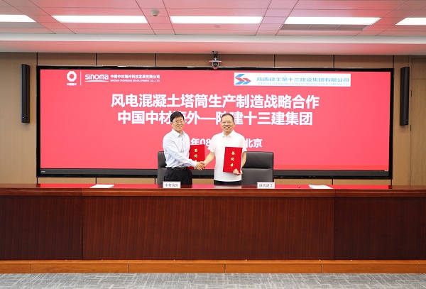 8月1日,集團(tuán)與中國中材海外科技發(fā)展有限公司在北京就風(fēng)電混凝土塔筒生產(chǎn)制造簽訂戰(zhàn)略合作協(xié)議并簽訂陜西榆林定邊項目混凝土塔筒預(yù)制管片采購合同。中國中材海外科技發(fā)展有限公司黨委書記、執(zhí)行董事高超,集團(tuán)黨委書記、董事長卜國平代表雙方簽約并致辭。