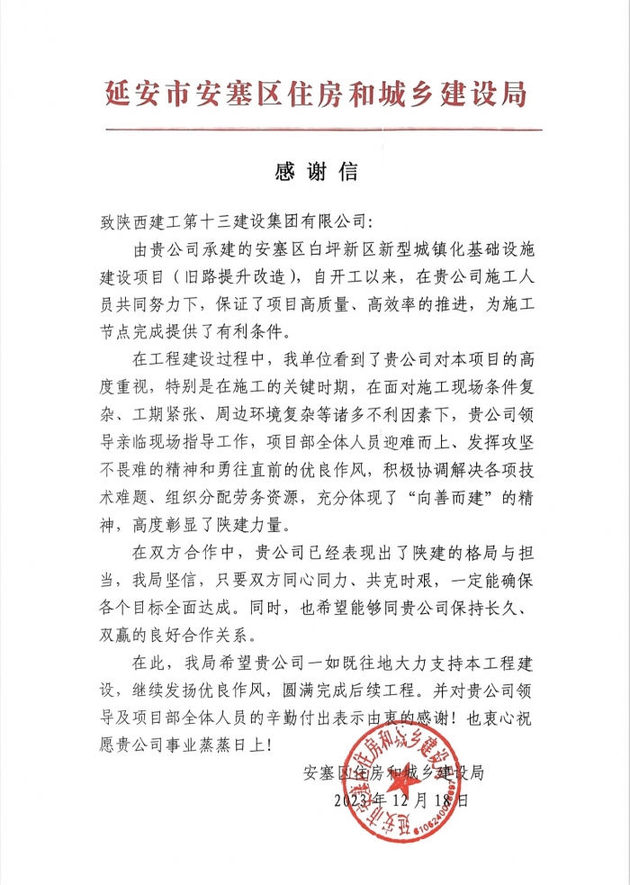 近日,集團(tuán)第一工程公司施工的安塞區(qū)白坪新區(qū)新型城鎮(zhèn)化基礎(chǔ)設(shè)施建設(shè)項(xiàng)目收到來自安塞區(qū)住建局的感謝信,對集團(tuán)項(xiàng)目部管理團(tuán)隊(duì)在施工過程中的迎難而上、攻堅(jiān)克難,高質(zhì)量、高效率推進(jìn)項(xiàng)目建設(shè)予以高度贊揚(yáng)。