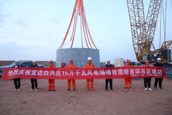 近日,集團新型建材公司為中材海外榆林定邊白興莊150MW風(fēng)電場項目生產(chǎn)的混凝土塔筒管片首環(huán)吊裝順利完成。