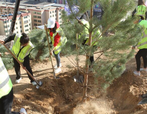 期間,大家互相配合,有的揮鍬鏟土、有的扶樹填土,忙的不亦樂乎。經(jīng)過一個(gè)多小時(shí)的努力,40多顆松樹在長青路觀景臺(tái)“安家落戶”,為那里添上了一片新綠。